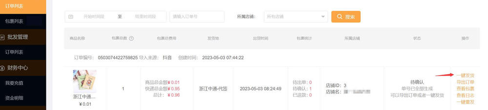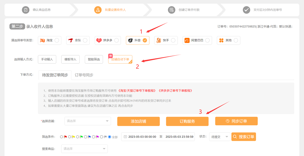 9、这时会看到店铺已添加成功,可同步订单(然后也能根据标记,时间,状态,搜索商品等来筛选订单)——勾选订单——提交
