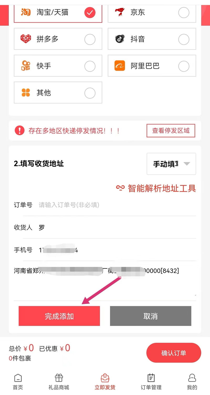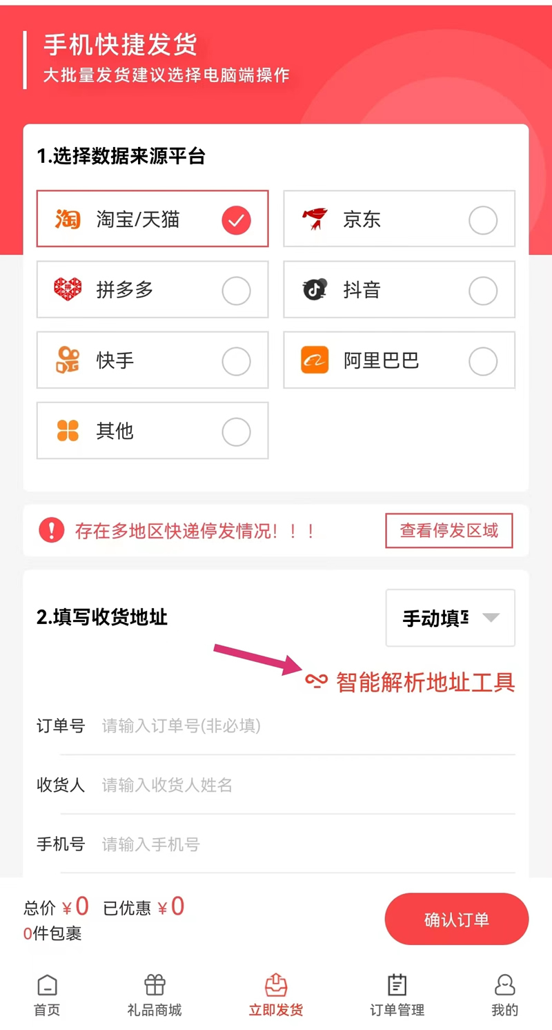 3、选择订单来源的平台,勾选,再点击 智能解析地址工具,复制收件信息进去。